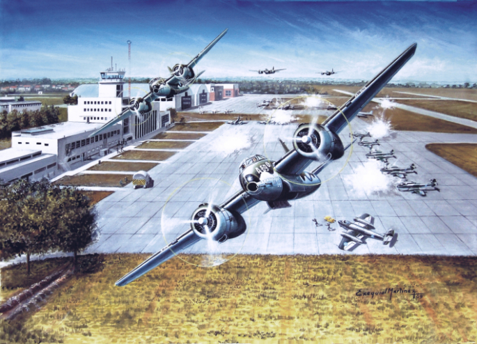 En el cuadro se da imagen a un famoso ataque a la VII Brigada, asiento de la caza interceptora donde los Calquín en un ejercicio burlaron la cadena de radares y los cazas bombardeando con bolsas de harina la pista y los hangares de Morón.