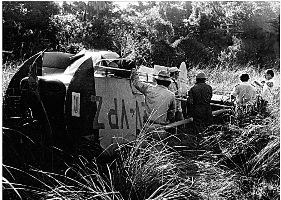 Se puede ver la pala de la hélice torcida y rota. Era una isla en un delta. Había que hacer caminos y puentes que llevaban la operación a costos superiores el avión, no había posibilidad de una pista porque era muy chica.